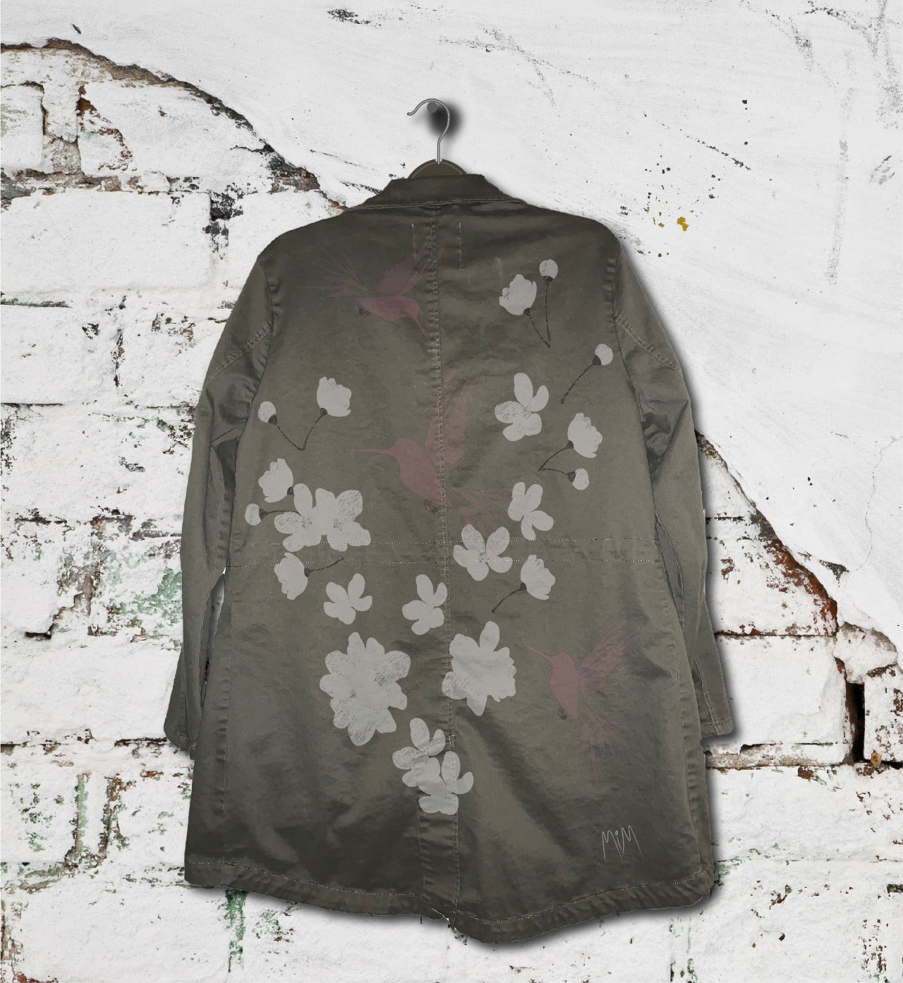 Soft Cherry Blossoms and Hummingbirds. Hand-painted on a very cool, dark khaki bush jacket. Our designs are one-of-a-kind and hand-painted on each garment with a serious passion. The design comes in the size shown. If you would like a similar design on a different sized garment, let us know! Due to the nature of production, there may be slight differences in the artwork. Custom designs are encouraged.