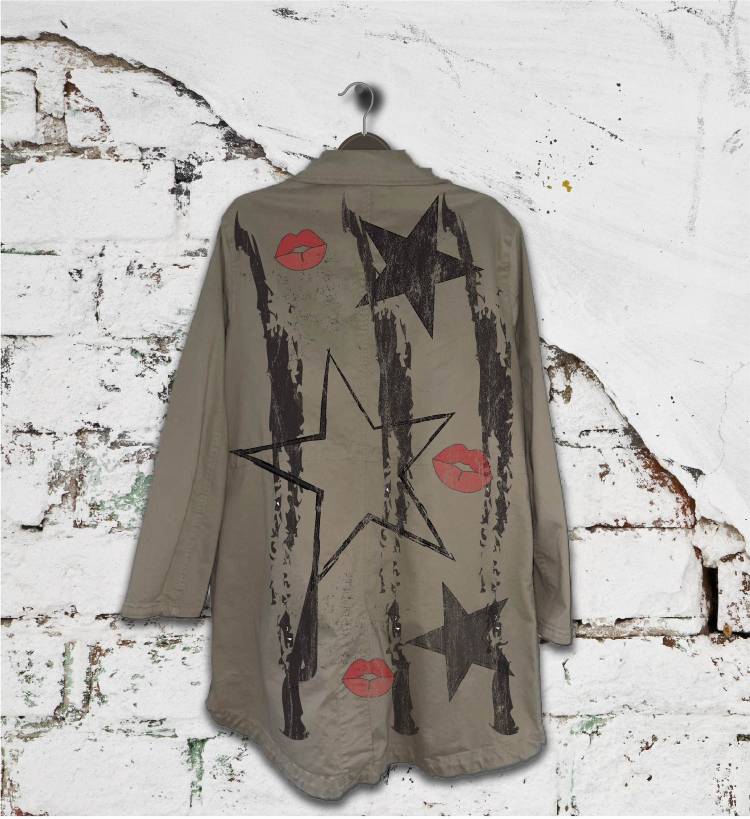 Stars - Hand-painted on a very cool, light khaki bush jacket. Our designs are one-of-a-kind and hand-painted on each garment with a serious passion. The design comes in the size shown. If you would like a similar design on a different sized garment, let us know! Due to the nature of production, there may be slight differences in the artwork. Custom designs are encouraged.